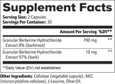 Ingrédients : Extrait de chlorhydrate de berbérine granulaire 97 % (écorce), extrait de chlorhydrate de berbérine granulaire 8 % (écorce/racine), cellulose (capsule végétale), MCC (cellulose microcristalline), L-leucine, huile d'olive.